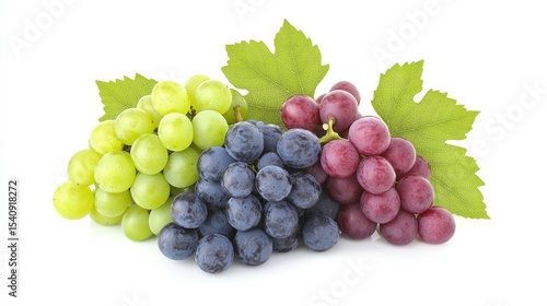 Fototapeta premium Three Grape Varieties Composition of Green, Red and Blue Grapes with Leaves,...