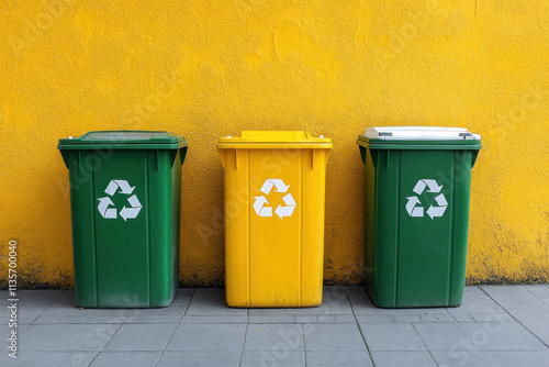 Fototapeta premium Three green and yellow trash bins on a sidewalk.
