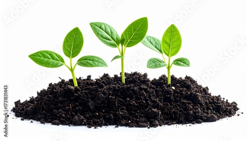 Naklejka premium Three green seedlings sprouting from dark soil on white background, symbolizing growth, sustainability, and new beginnings.