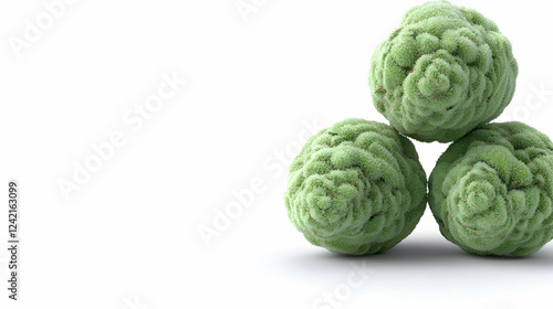 Fototapeta premium Three green textured spheres, white background, studio shot, food illustration