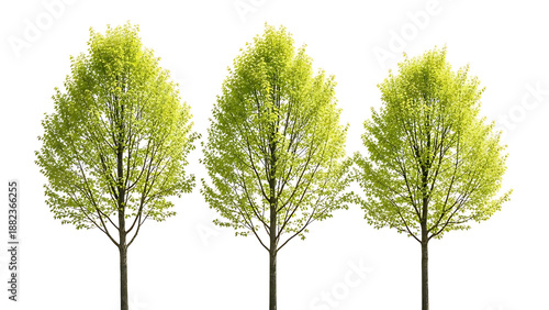 Obraz premium three green trees with fresh spring foliage stand tall isolated on a white...
