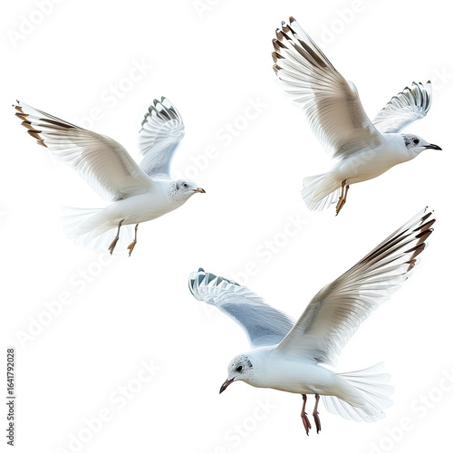 © Bombong, Obraz premium Three gulls soaring, wings spread, coastal background, nature photography, website design