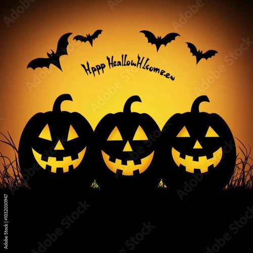 © Ilja, Fototapeta premium Three Halloween Pumpkins with Carved Faces, Orange Background, Bats, and Happy Halloween Message