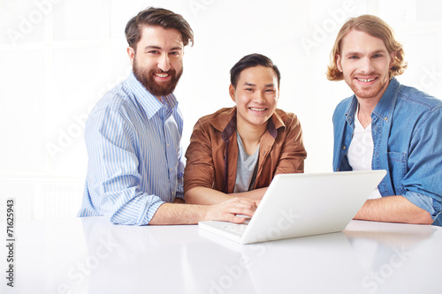 © pressmaster, Fototapeta premium Three handsome young men using a laptop
