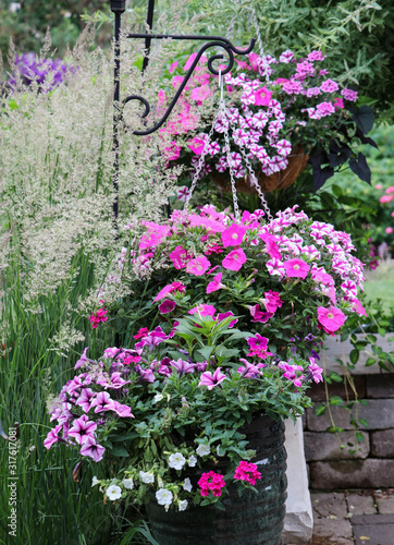 Fototapeta premium Three hanging baskets of pink and white petunias in front of Karl Reed forester ornamental grasses