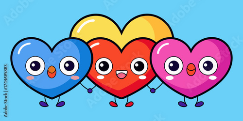 Fototapeta premium Three happy cartoon hearts holding hands on a blue background