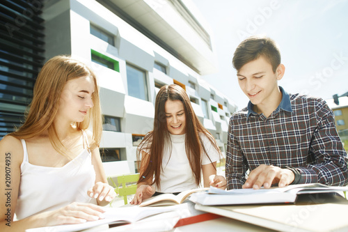 Obraz premium three happy high school students learning outdoors