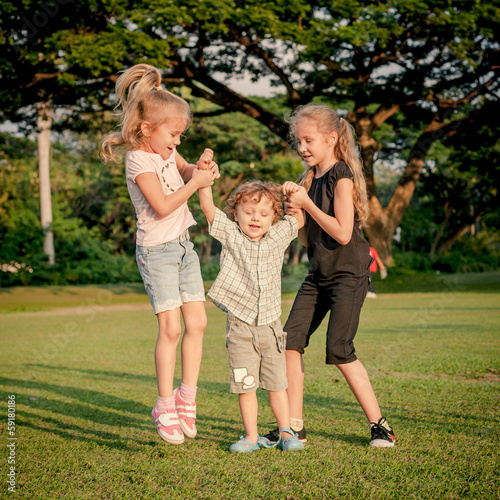 Fototapeta premium three happy little kids playing in the park in the day time