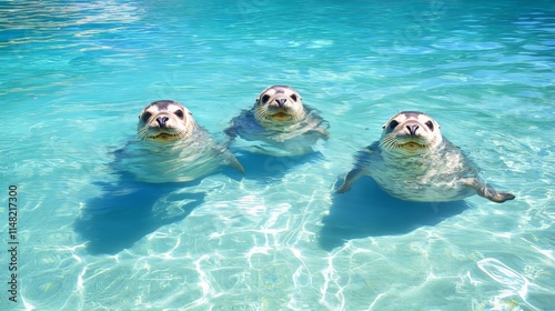 Fototapeta premium Three Happy Seals Swimming in Turquoise Water