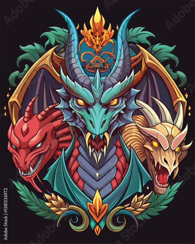 Fototapeta premium Three Headed Dragon with Leaf, Gold Accents