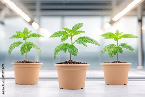 Fototapeta premium Three healthy green plants growing in pots under bright artificial lights in a modern greenhouse