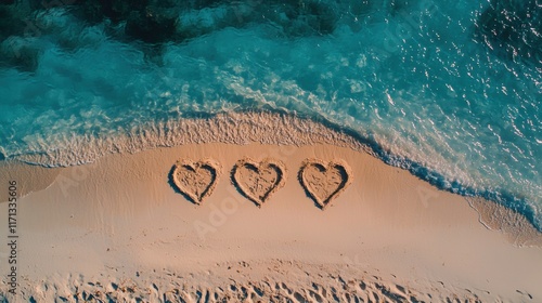 © Marta Maksymiv, Fototapeta premium Three hearts handwritten on sandy beach with ocean wave on background. Three hearts drawn on sand with clear blue sea, copy space. Concept of family honeymoon travel and greetings for valentine's day