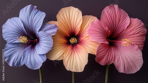 © ACE STEEL D, Fototapeta premium Three Hibiscus Flowers in Blue, Peach, and Pink