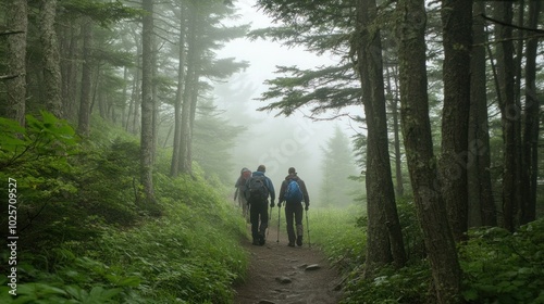 Obraz premium Three hikers walk through a foggy forest on a hiking trail.