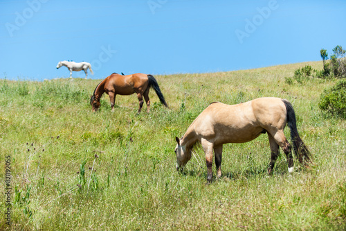 © Frank Fennema, Fototapeta premium Three horses eating on hillside field
