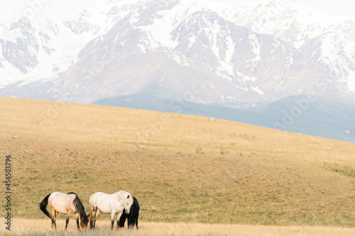 © Пётр Рябчун, Fototapeta premium Three horses stand on the lawn in the mountains. Three wild horses against the backdrop of a mountain landscape