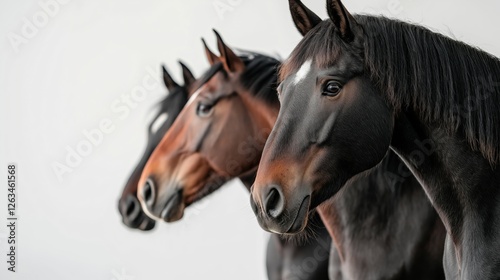Fototapeta premium Three horses standing next to each other with one of them being black. The horses are all brown in color