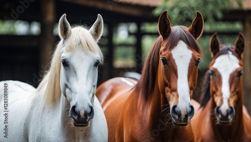 Naklejka premium Three horses standing side by side in a barn setting with blurred background...