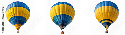 © YiuCheung, Obraz premium Three hot air balloons in flight with yellow and blue colors.