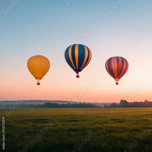 © Priya, Fototapeta premium three hot air balloons soar over a green field at sunrise