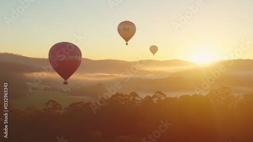 © Umi, Obraz premium Three hot air balloons soar over a misty valley at sunrise.