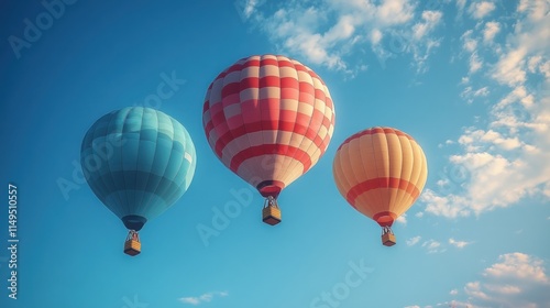 © Ali, Naklejka premium Three hot air balloons soar, sunny sky.