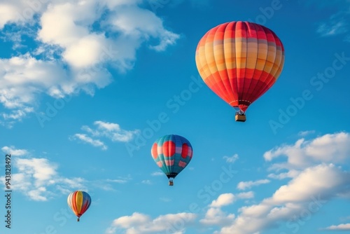 © Nico, Obraz premium Three Hot Air Balloons Soaring Through a Blue Sky with White Clouds