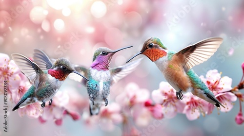 © Sonya, Fototapeta premium Three Hummingbirds Sitting on Tree Branch with Pink Flowers