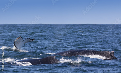 Naklejka premium Three humpback whales surfacing off the coast of Knysna, South Africa
