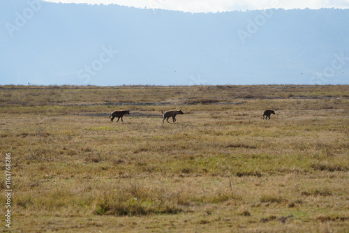 Naklejka premium Three Hyenas Roaming the Plains of Ngorongoro Crater, Tanzania – African Wildlife Safari Scene