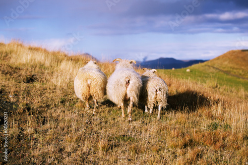 Fototapeta premium Three Iceland sheeps in autumn field at sunset