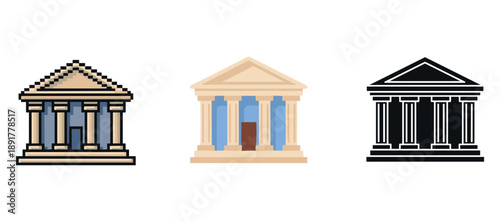 © supplement, Naklejka premium Three iconic bank building designs in pixel, flat, and outline styles
