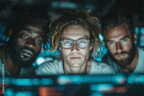 Obraz premium Three individuals focused on a computer screen illuminated by blue light...
