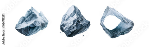 Fototapeta premium Three isolated, blue, rocky shapes against a white background.