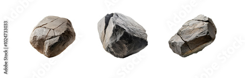 Obraz premium Three isolated, cracked grey rocks with white background.