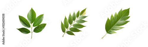 Fototapeta premium Three isolated green leaf sprigs with detailed veins, on a white background.