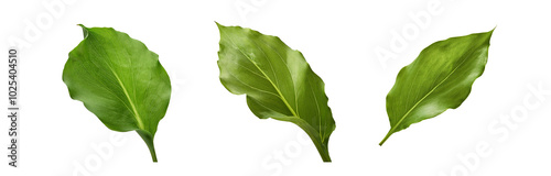 © joeycheung, Fototapeta premium Three isolated green leaves with visible veins on a white background.