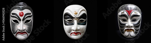 © YiuCheung, Naklejka premium Three isolated, ornate masks against a black background.