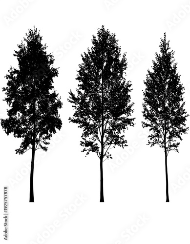 © pendik, Obraz premium Three isolated trees stand against a white background, creating stark black silhouettes of nature's graceful forms