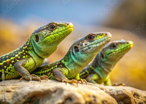 Fototapeta premium Three Italian Wall Lizards Basking on Ancient Stone - Minimalist Nature...
