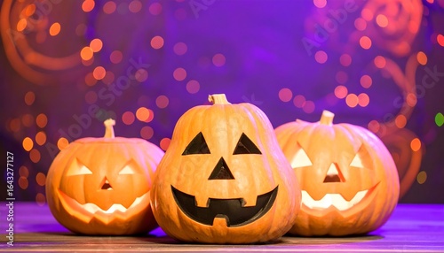 © Jonatan, Fototapeta premium Three jack-o'-lanterns on a table against a blurred purple background