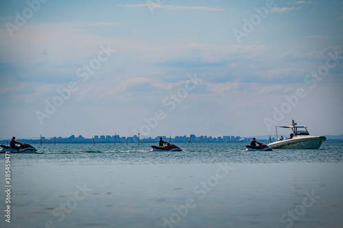 © Photopet, Naklejka premium Three jets, boat, and the city behind