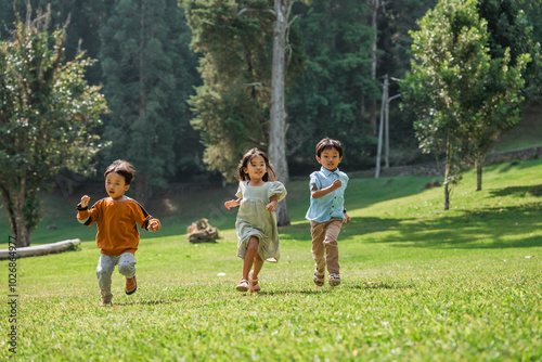 Obraz premium Three joyful and happy children are playing together joyfully in a beautiful outdoor setting