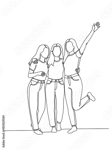 © MstAfia, Fototapeta premium Three joyful friends standing together with one raising their arm in excitement