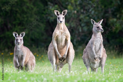 © Cynthia, Fototapeta premium Three Kangaroos on grass field, looking at camera