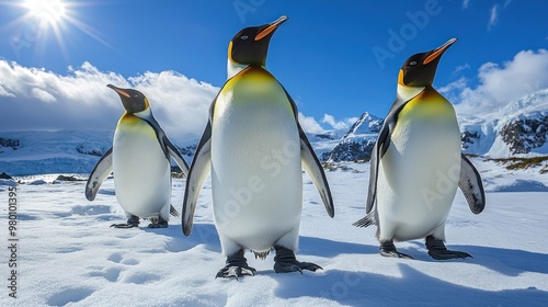 © Alienmarsh, Fototapeta premium Three King Penguins on an Antarctic Landscape