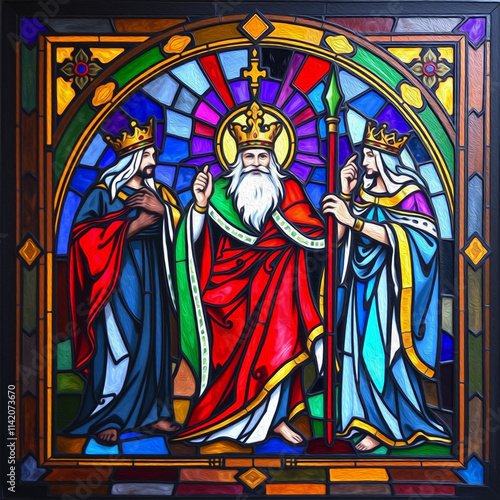 © Wioletta, Fototapeta premium Three Kings. Artistic illustration painted with oil paint. Colorful stained glass. Christmas card and cover design