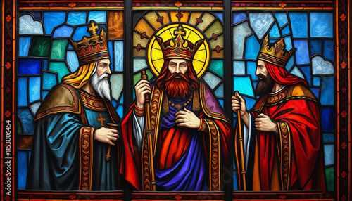 © Wioletta, Fototapeta premium Three Kings. Artistic illustration painted with oil paint. Colorful stained glass. Christmas card and cover design