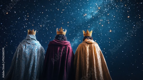 © 69, Naklejka premium Three Kings Gazing at Starry Night Sky with Majestic Crowns