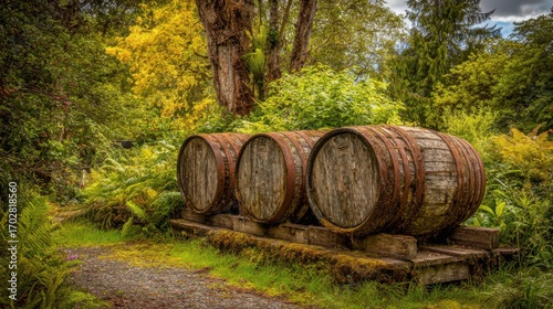 © Babb, Fototapeta premium Three large wooden barrels rest on a wooden platform surrounded by vibrant foliage and towering trees under a partly cloudy sky, creating a tranquil atmosphere in nature.